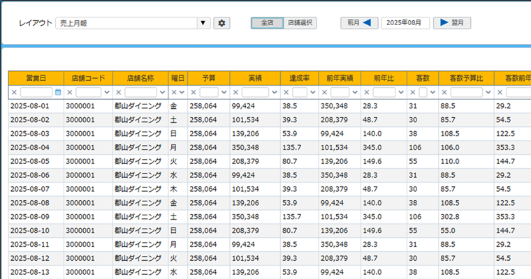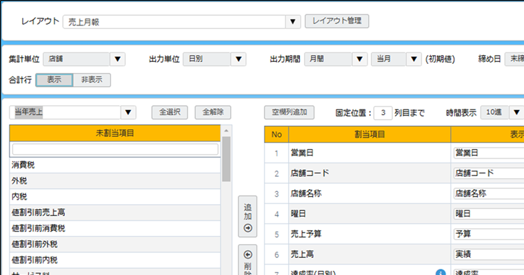②集計基準(日毎/週毎/月毎、店舗毎、従業員毎等)