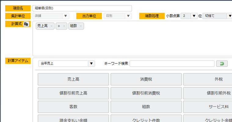 「FoodingJournal上にある項目や特定の数値を用いて、計算結果が見たい」という場合にお客様毎に任意の計算設定(四則演算)が可能です。